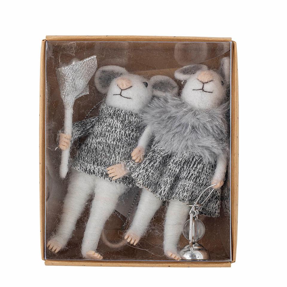 Das niedliche 2er Set grauer Mäuse in Kleidung mit Strauß und Pelz zum Anhängen von Bloomingville ist die perfekte Ergänzung für eine stilvolle und zugleich verspielte Weihnachtsdekoration. Die liebevoll gestalteten Figuren begeistern mit ihren feinen Details, von der eleganten Kleidung bis hin zu kleinen Accessoires wie einem Strauß und kuscheligem Pelz, die ihnen einen besonders charmanten Charakter verleihen.