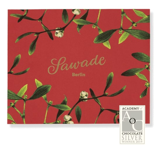 Die klassische Weihnachtsedition von Sawade Berlin: tiefes, sattes rot, ein Mistelzweig und herrlich leckere Pralinen.