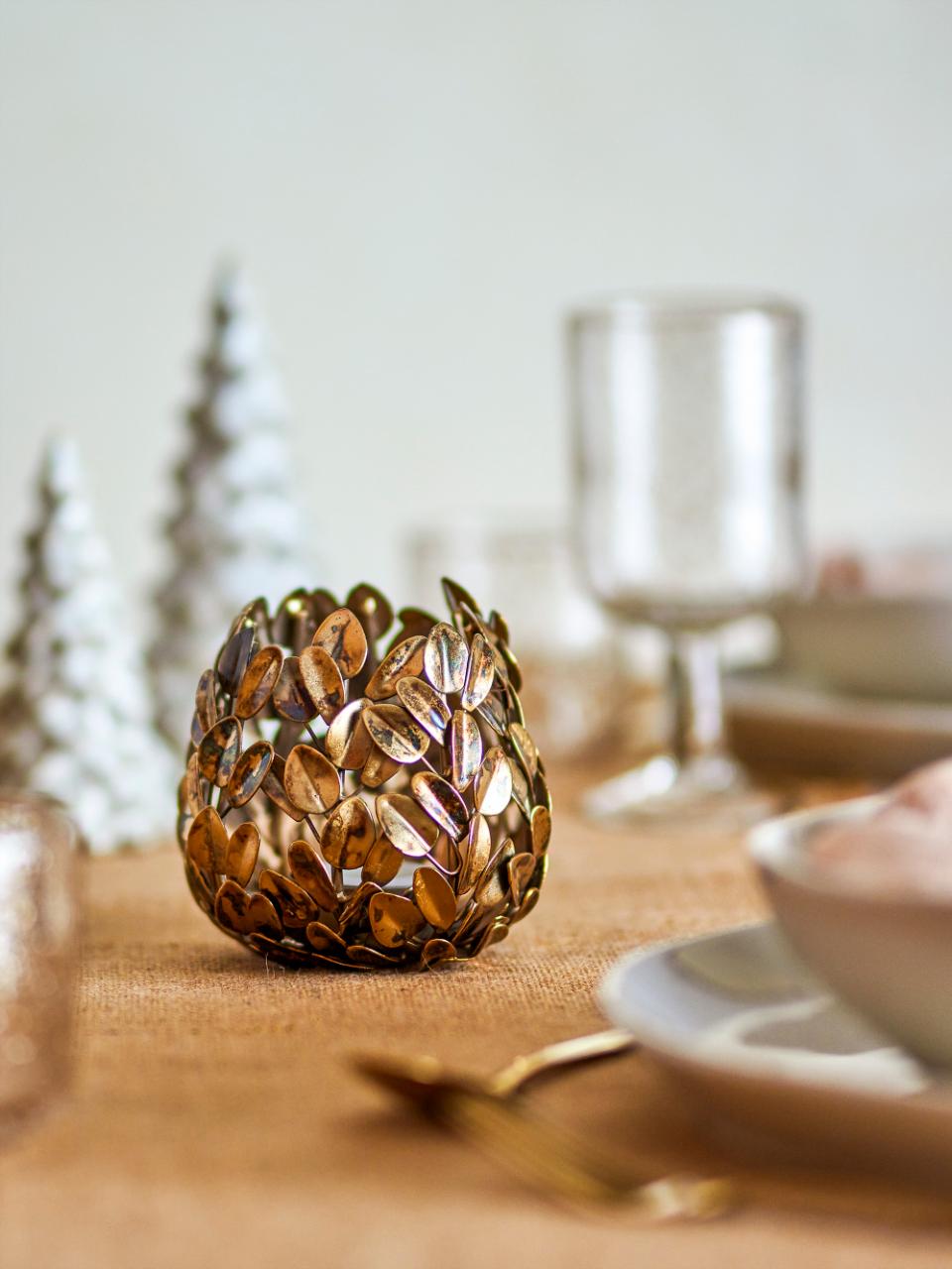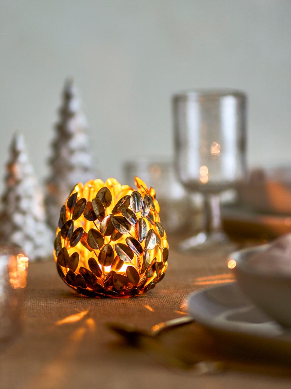 Der runde Teelichthalter in edler messingfarbener Blätteroptik ist ein dekoratives Highlight, das Natürlichkeit und Eleganz auf stilvolle Weise verbindet. Das filigrane Design der Blätter lässt den Schein des Teelichts sanft hindurchschimmern und zaubert ein stimmungsvolles Spiel aus Licht und Schatten, das eine warme und gemütliche Atmosphäre schafft.